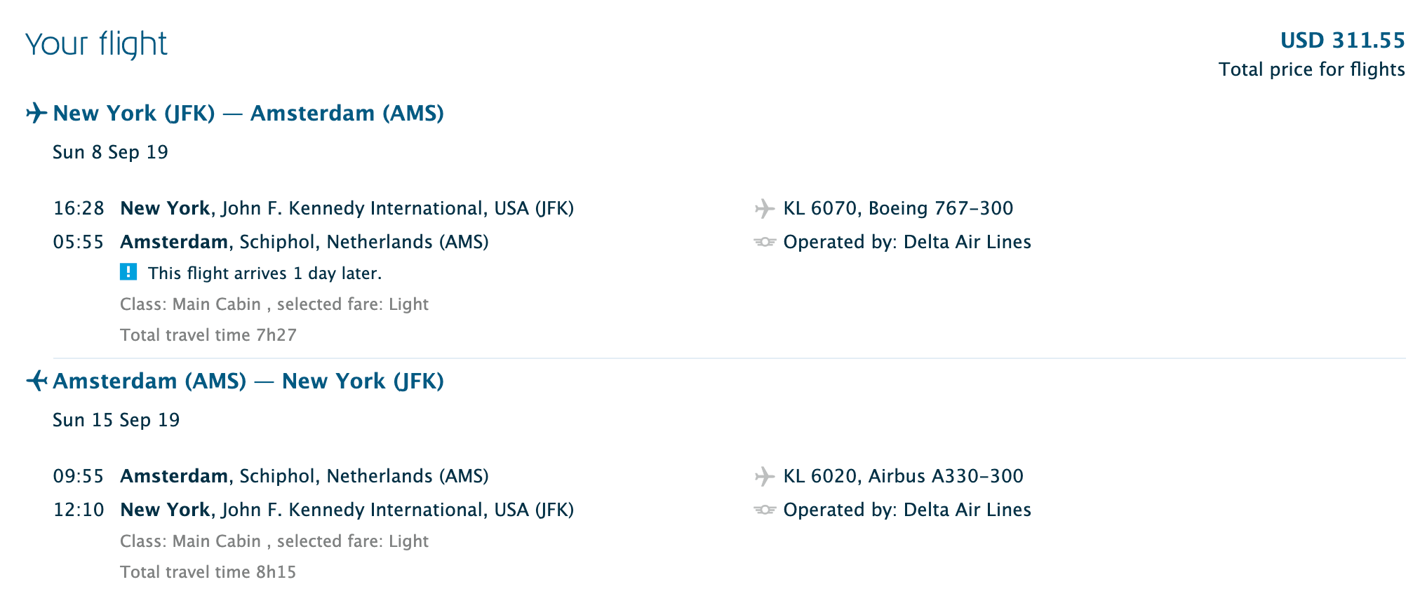 New York (JFK) to Amsterdam (AMS) for $312 round-trip on KLM: