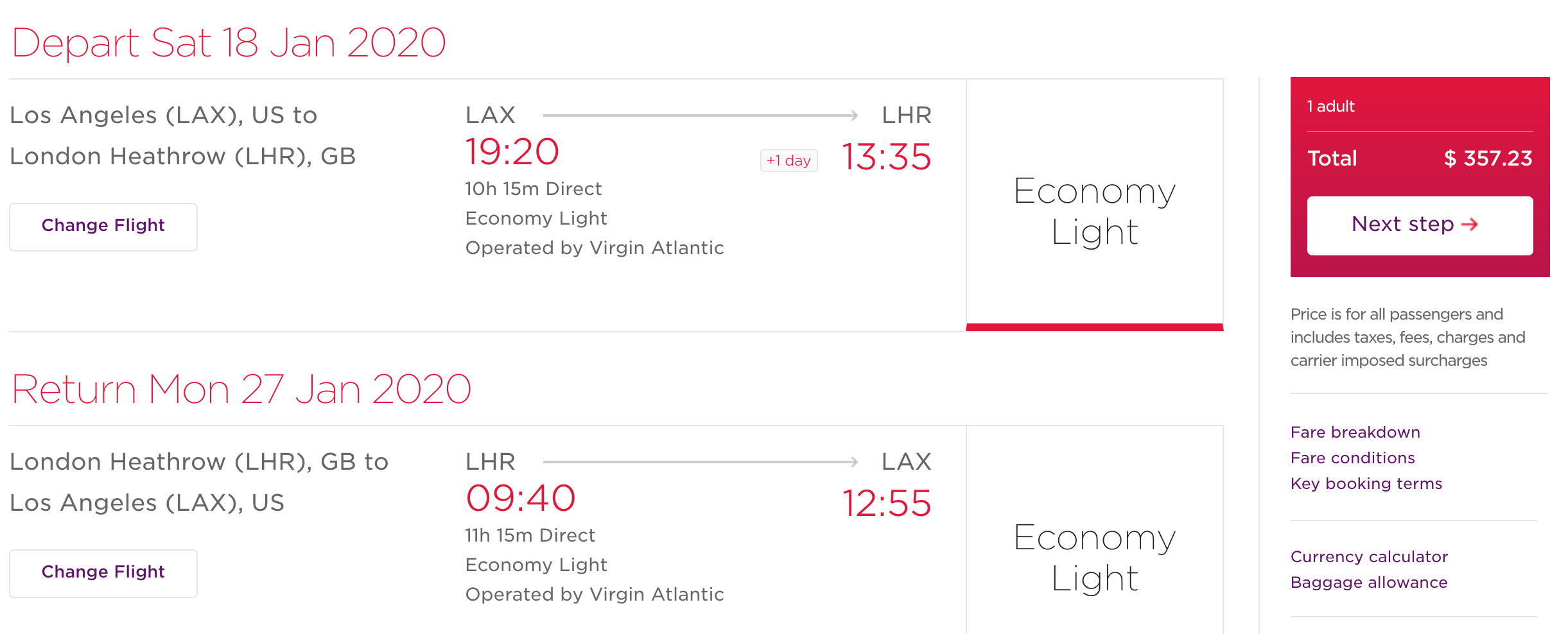 Los Angeles (LAX) to London (LHR) for $357 round-trip on Virgin: