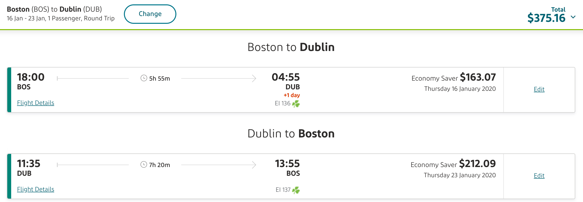 Boston (BOS) to Dublin (DUB) for $375 round-trip on Aer Lingus: