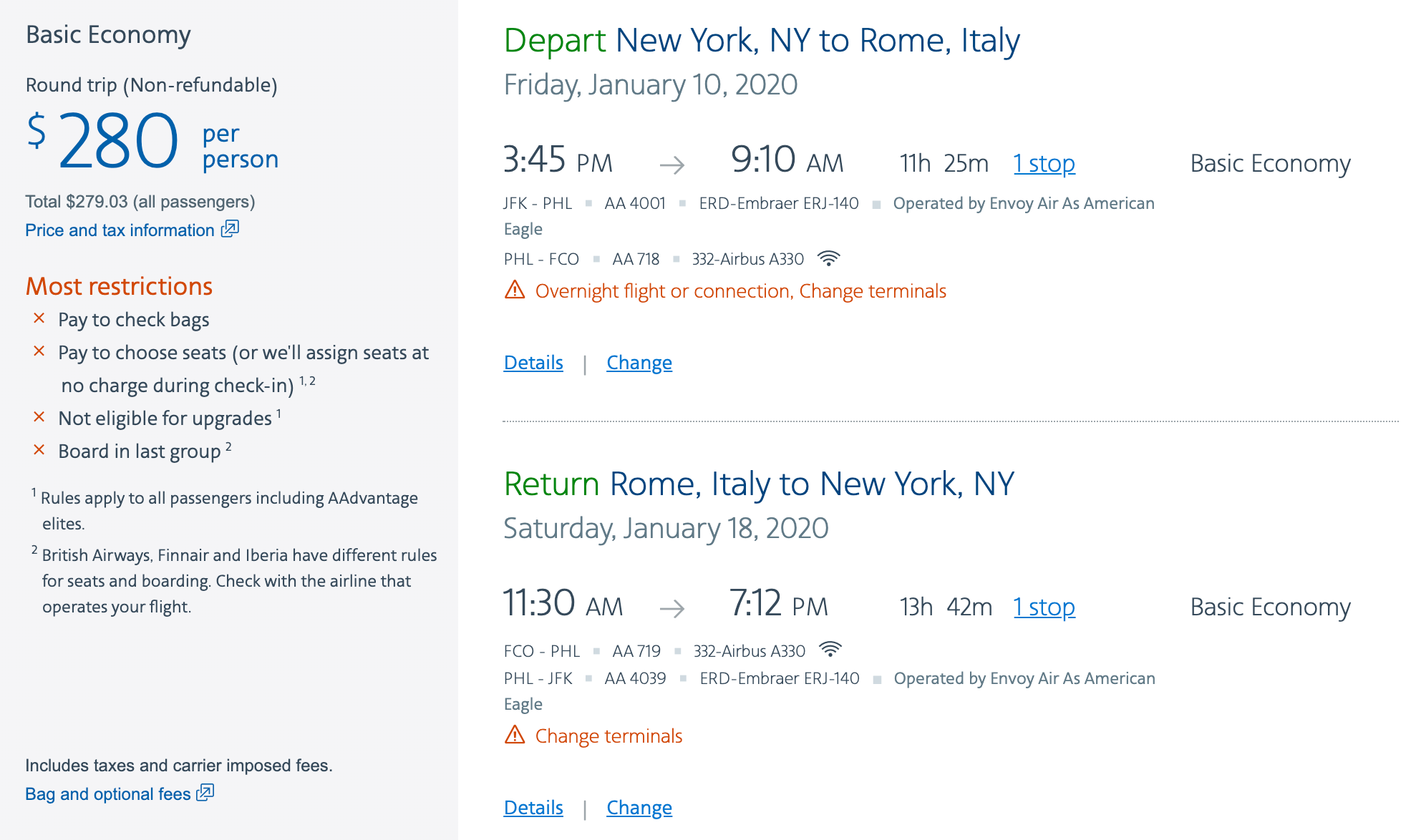 New York (JFK) to Rome (FCO) for $280 round-trip on American: