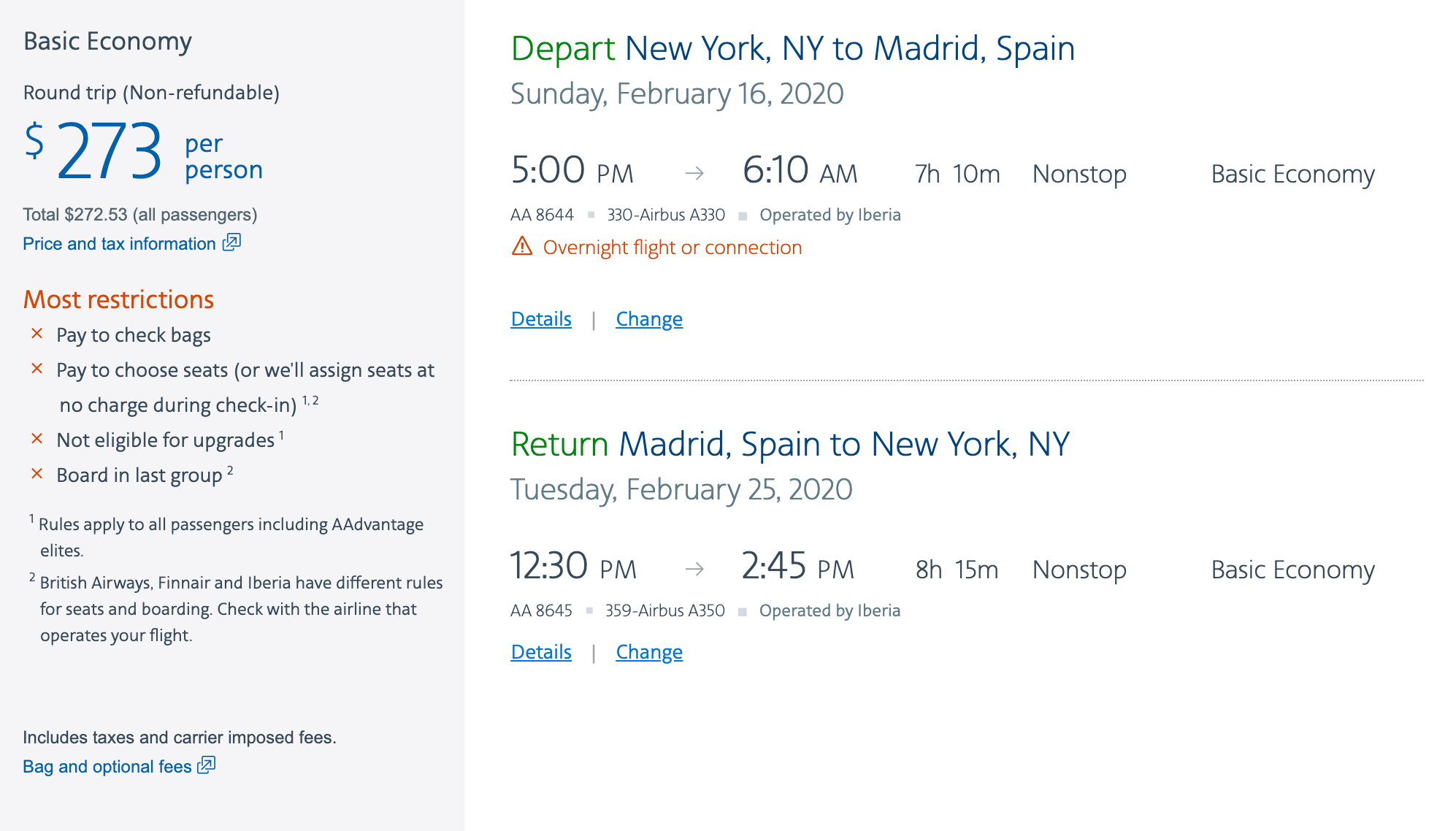 New York (JFK) to Madrid (MAD) for $273 round-trip on American: