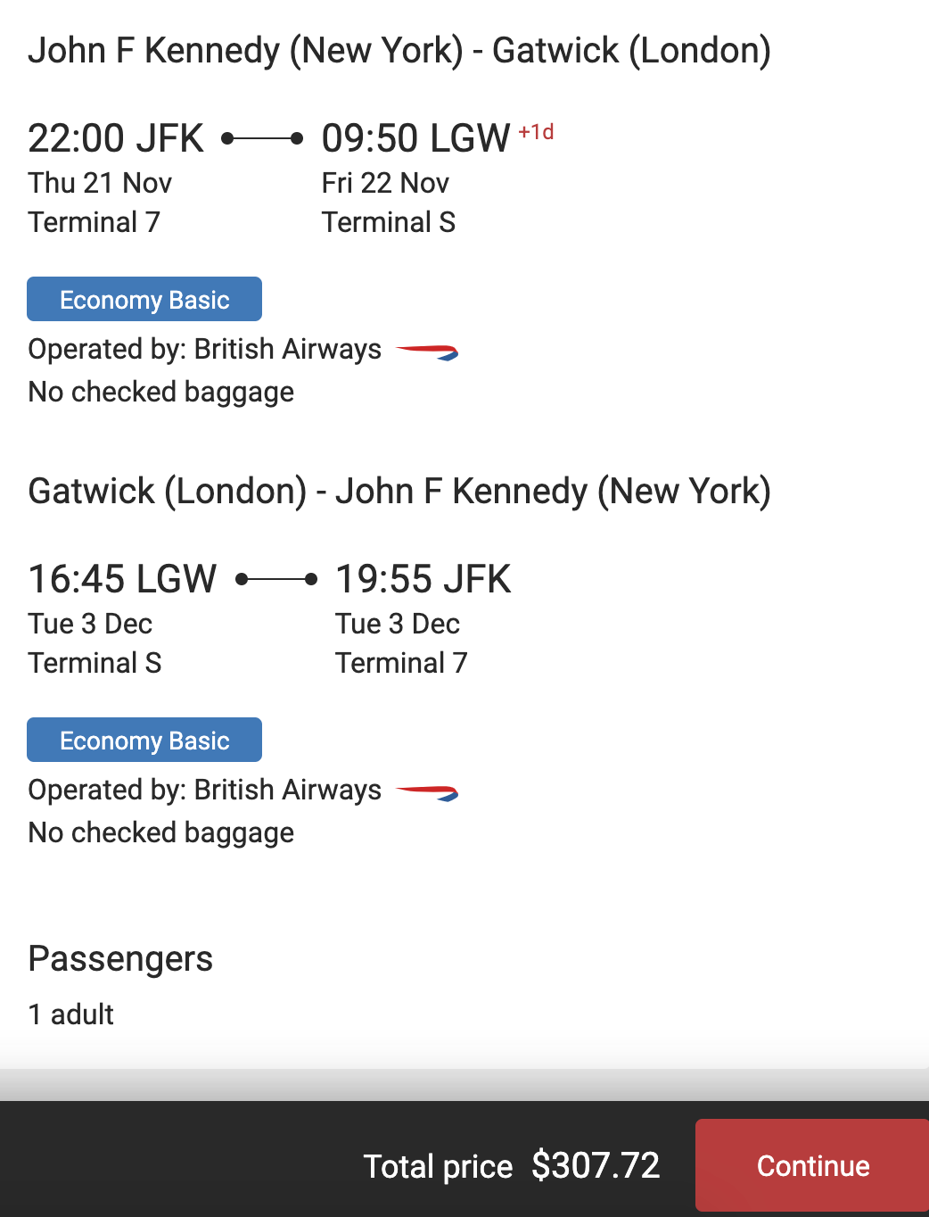 New York (JFK) to London (LGW) for $308 round-trip on British Airways: