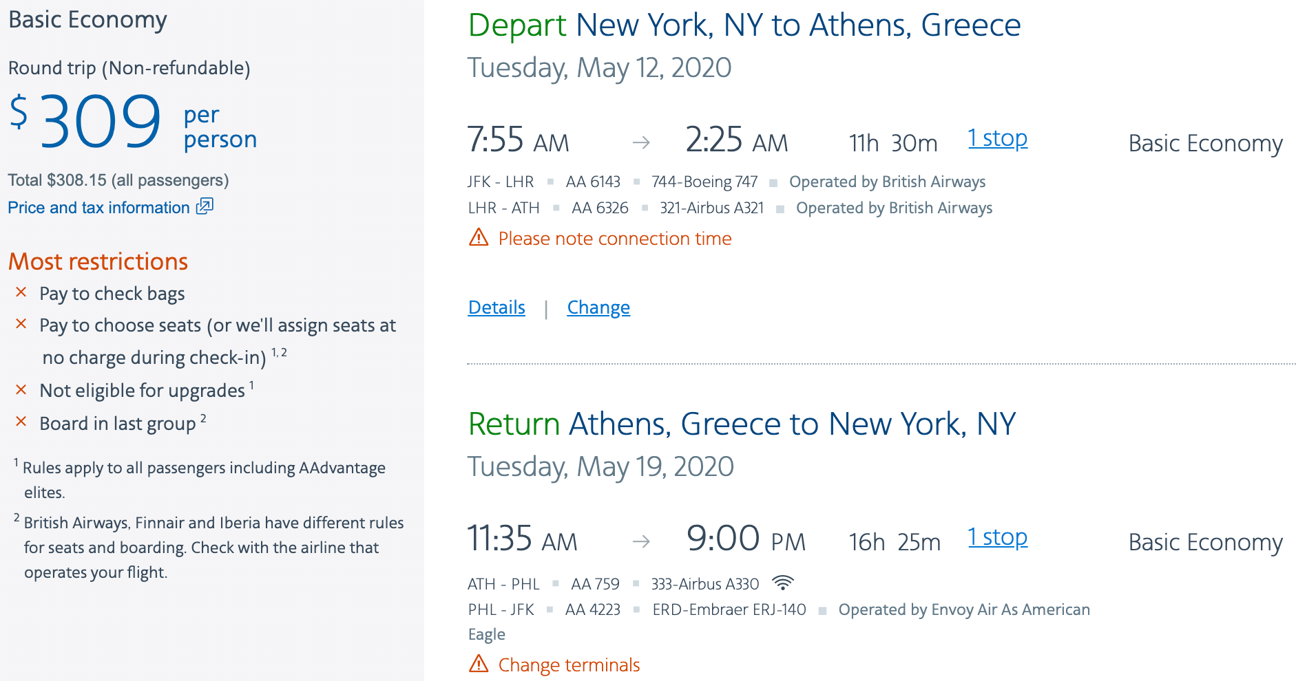 New York (JFK) to Athens (ATH) on British Airways/American for $309 round-trip: