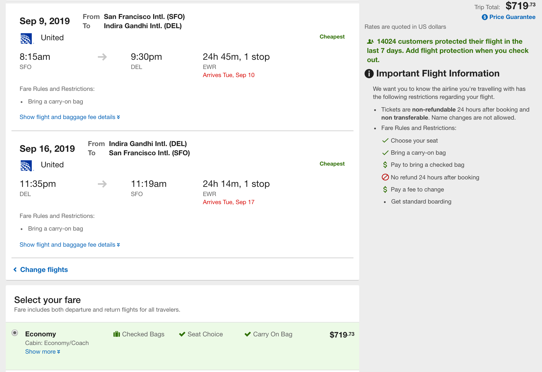 San Francisco (SFO) to Delhi (DEL) $720 round-trip on United via Expedia:
