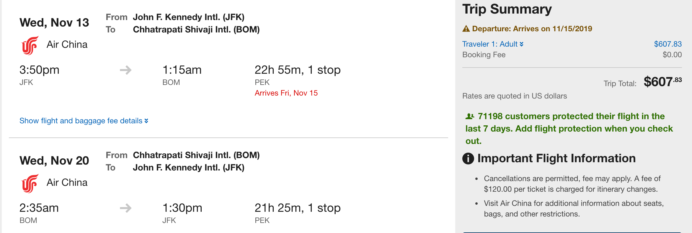New York (JFK) to Mumbai (BOM) $608 round-trip on Air China via Expedia: