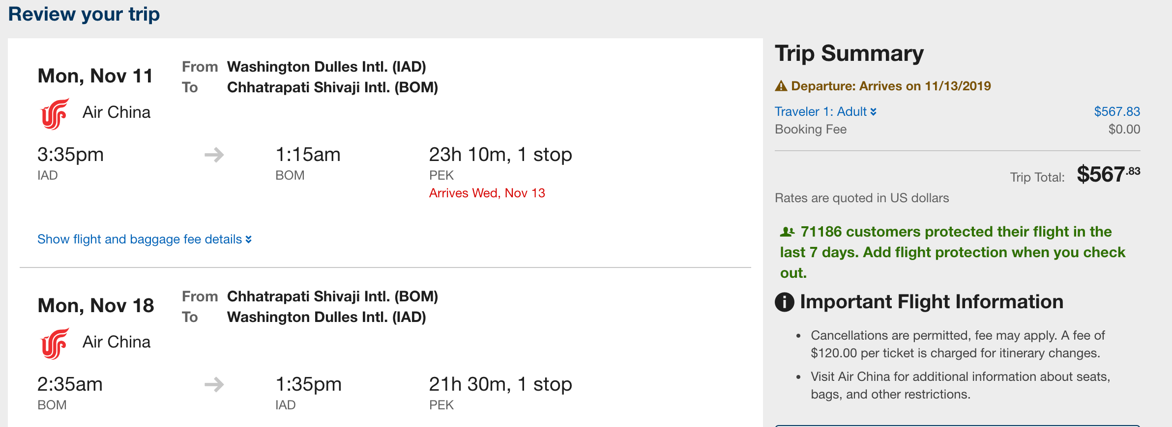 Washington Dulles (IAD) to Mumbai (BOM) $568 round-trip on Air China via Expedia: