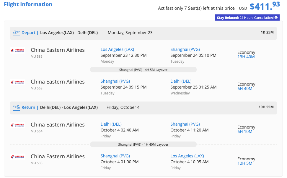 Los Angeles (LAX) to Delhi (DEL) $411 round-trip on China Eastern Airlines via ExploreTrip: