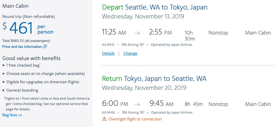 Seattle (SEA) to Tokyo (NRT) for $461 round-trip nonstop on Japan Airlines via American Airlines:
