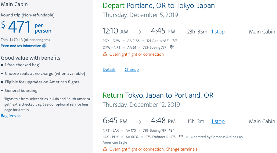 Portland (PDX) to Tokyo (NRT) for $470 round-trip on American: