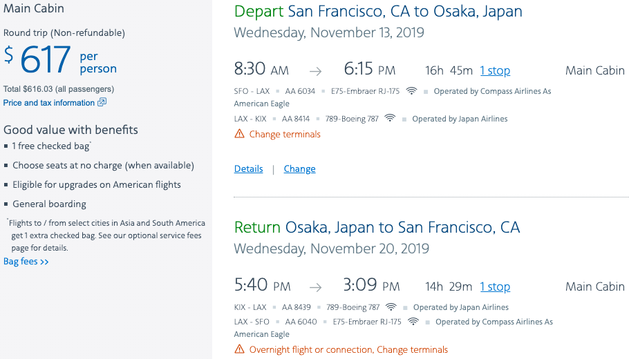 San Francisco (SFO) to Osaka (KIX) for $616 round-trip on American/Japan Airlines: