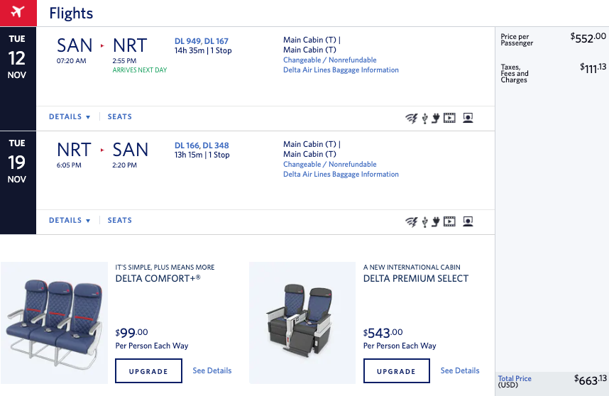 San Diego (SAN) to Tokyo (NRT) for $663 round-trip on Delta: