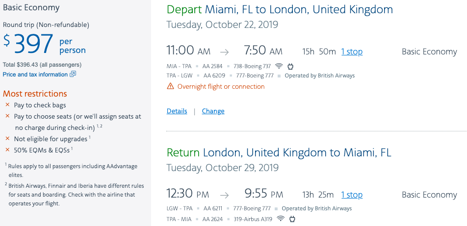 Miami (MIA) to London (LHR) for $396 round-trip on American/British Airways: