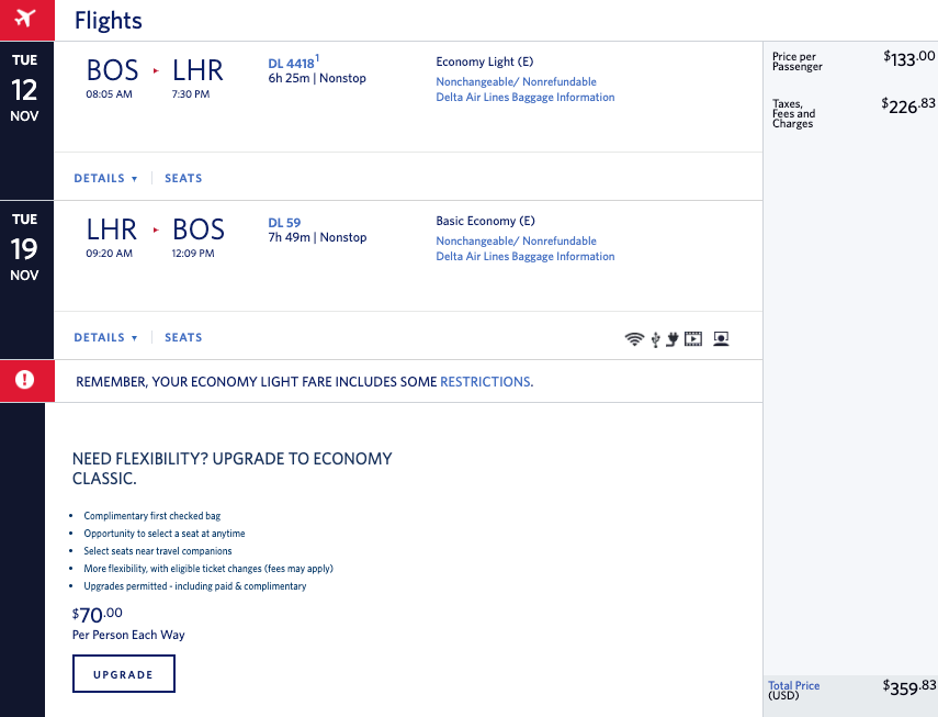 Flights are in basic economy and require you to pay extra for seat selection and checked bags (generally $60 each way).