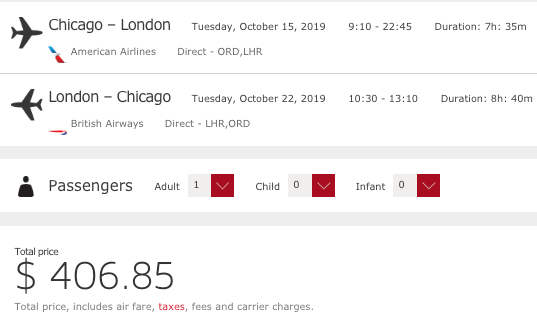 Chicago (ORD) to London (LHR) for $407 round-trip nonstop on American/British Airways via Iberia.com: