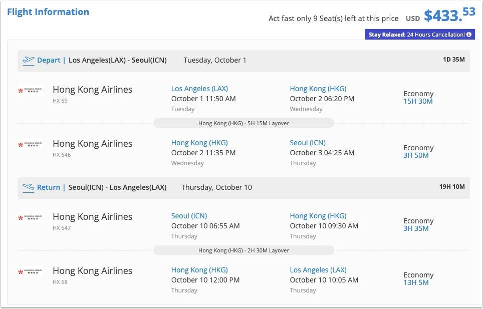 Los Angeles (LAX) to Seoul (ICN) for $434 round-trip on Hong Kong Airlines via ExploreTrip