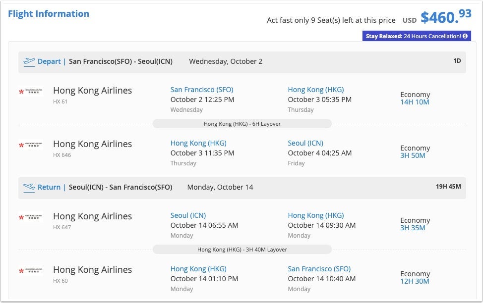 San Francisco (SFO) to Seoul (ICN) for $461 round-trip on Hong Kong Airlines via ExploreTrip