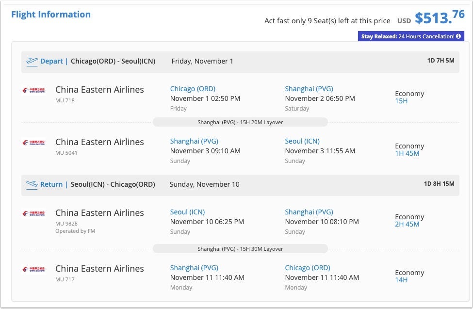 Chicago (ORD) to Seoul (ICN) for $514 round-trip on China Eastern Airlines via ExploreTrip