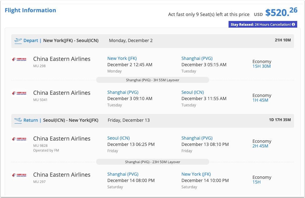 New York (JFK) to Seoul (ICN) for $520 round-trip on China Eastern Airlines via ExploreTrip