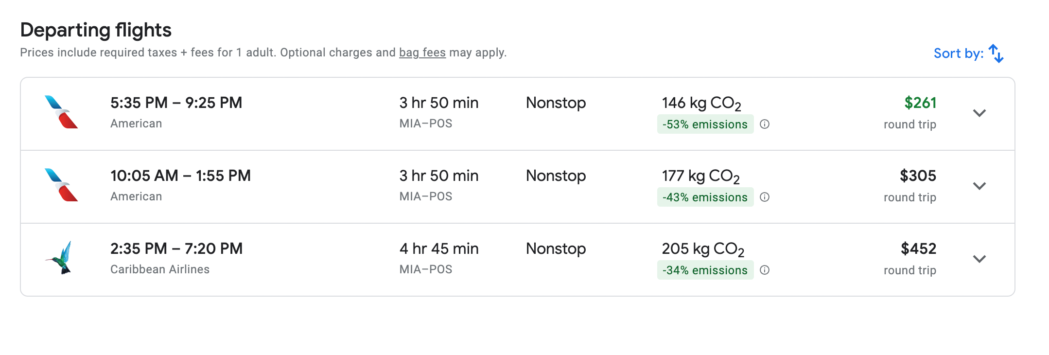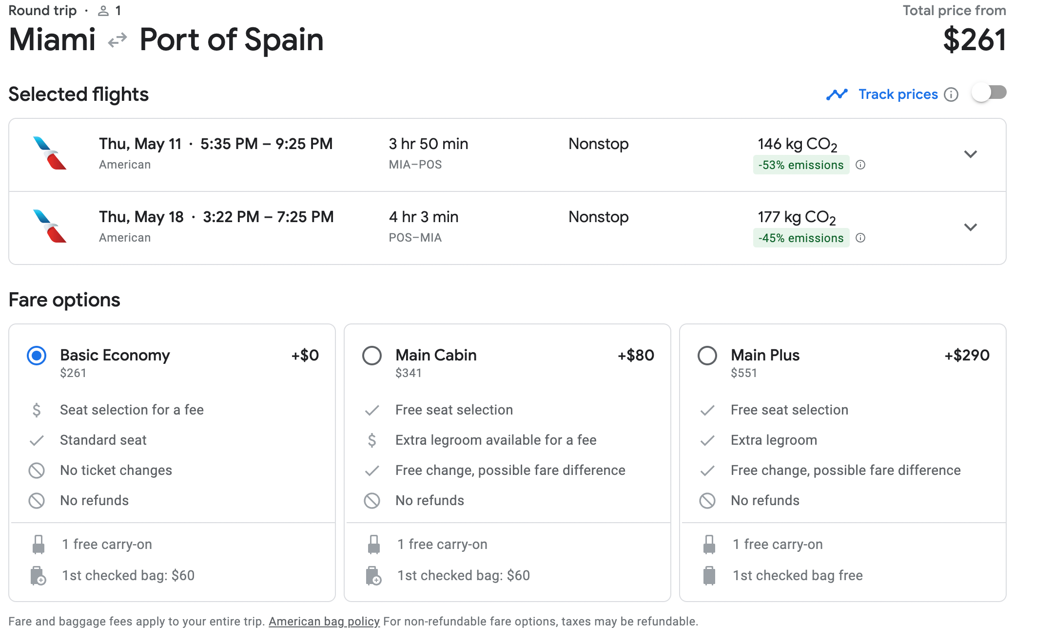 On Google Flights, American has two options for nonstop flights to Trinidad and Tobago from May 11 to May 18. One flight is the heavily discounted $261 one, departing Miami at 5:35 p.m. The other option, slightly more expensive at $305, leaves Miami earlier in the day, at 10:05 a.m. Both flights are three hours and 50 minutes long.