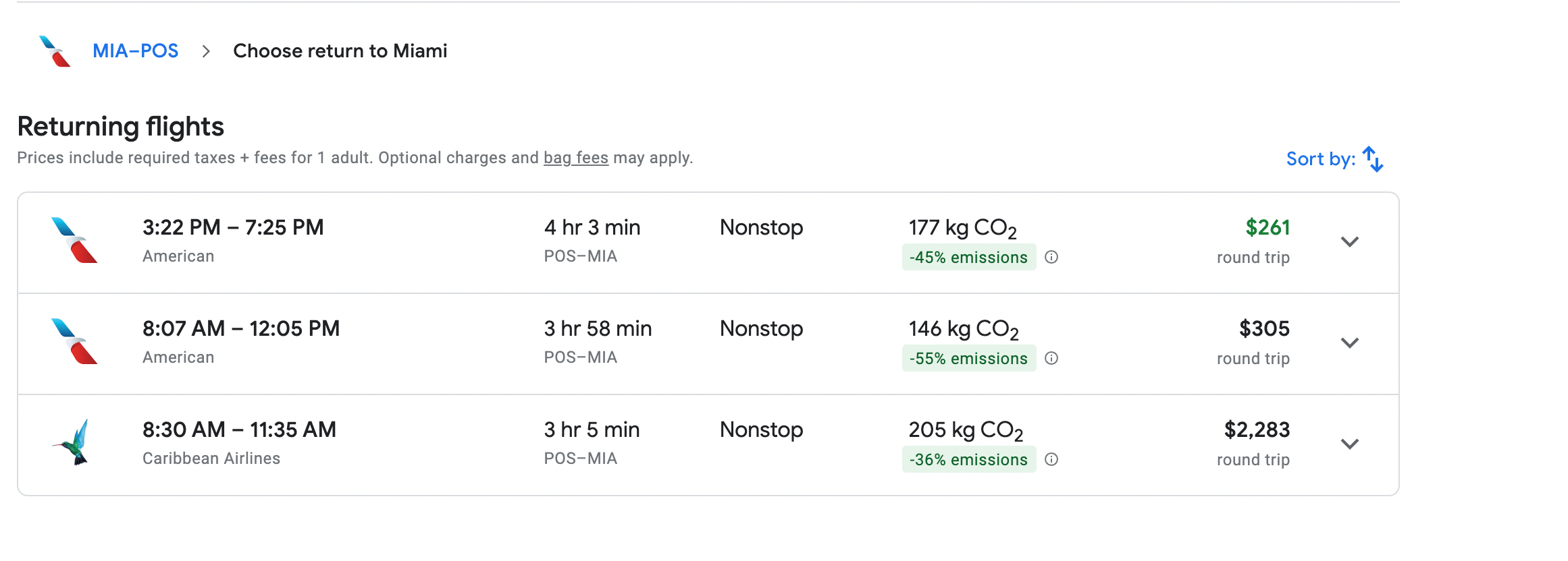 The cheaper returning flight to Miami is also priced at $261 and leaves Port of Spain at 3:22 p.m.