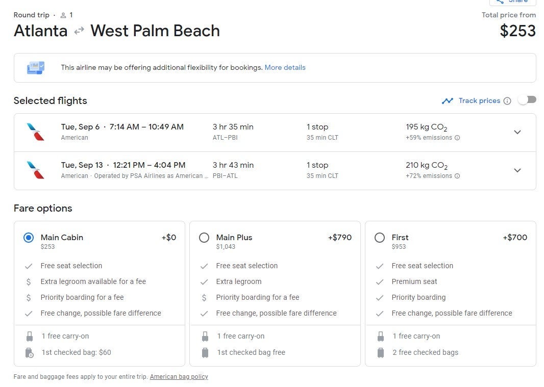 You can snag a flight from Atlanta (ATL) to West Palm Beach (PBI) for $253 round-trip. There are stops in Charlotte (CLT) for just over 30 minutes in each direction.