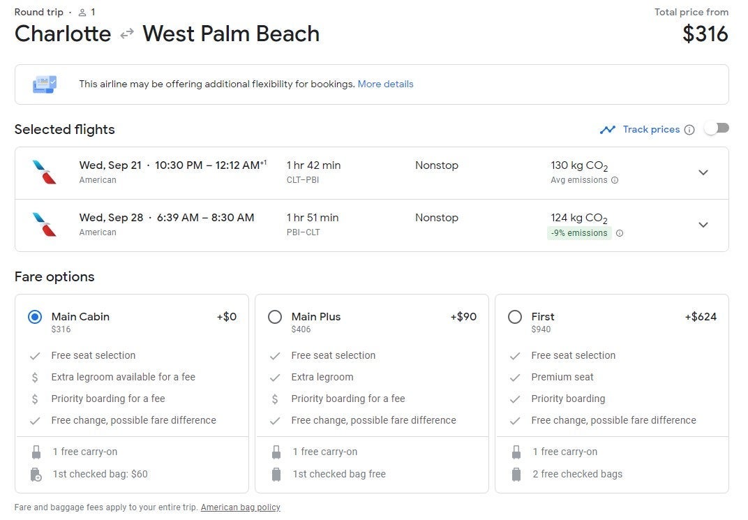 There are nonstop flights to Charlotte (CLT) from West Palm Beach (PBI) for $316 round trip, under two hours each way.