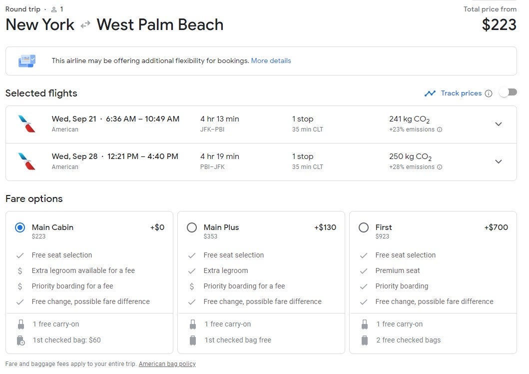 One of the most affordable deals is from New York (JFK) to West Palm Beach (PBI) for $223 round trip. This flight has a short layover in Charlotte (CLT) each way.