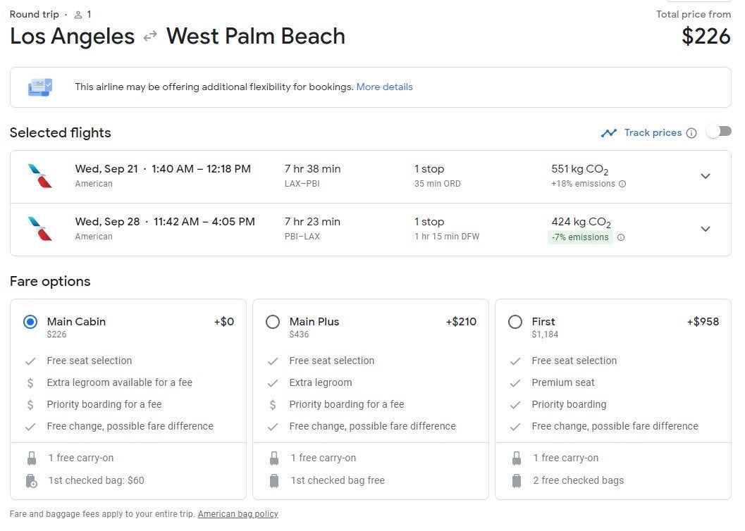 For a few bucks more, you can fly from Los Angeles (LAX) to West Palm Beach (PBI) for $226 round trip. The departure flight has a stop in Chicago (ORD) and the return flight has a stop in Dallas (DFW).