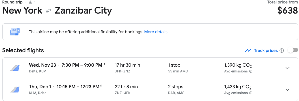 Since this deal is only from two cities, you can either search via Google Flights or head to the carriers directly to investigate availability. For the JFK-ZNZ route, Delta says it only has one seat left for the sale price, which is actually slightly less than advertised at $640.