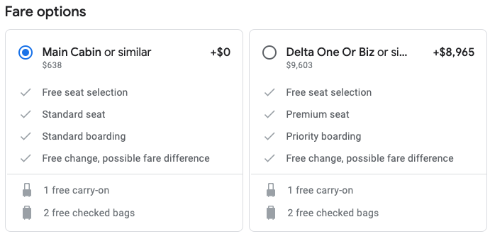 This flight is for Delta's economy class, which includes two free checked bags (unusual) and one free carry-on. For this long-haul flight specifically, dinner and snacks are included in this fare type. It is nonrefundable, but it can be changed for a fee plus any difference in fare.