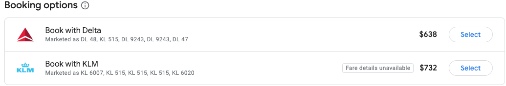 When searching on Google Flights, you'll notice that you can book this same flight through KLM for $732.