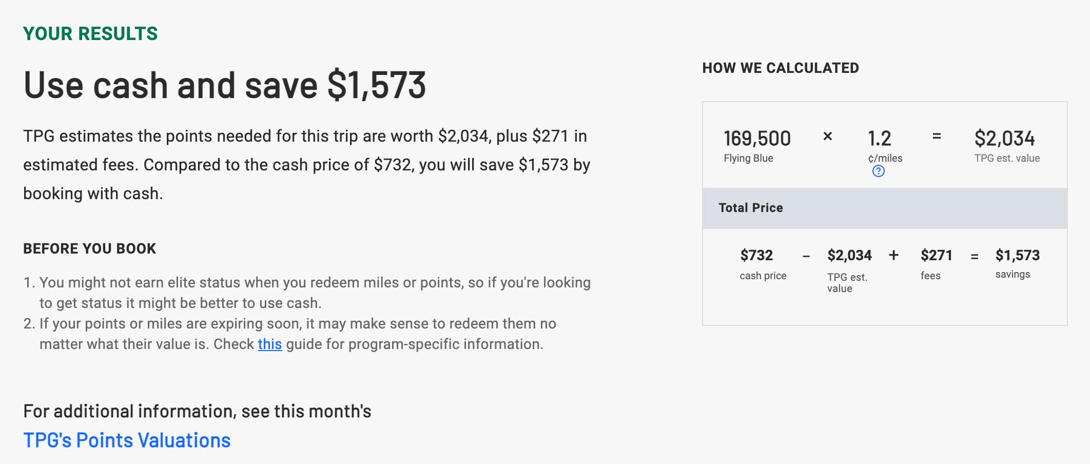 Because there are only two options for this flight, let's determine the cost of available flights in miles. For example, booking this flight through KLM would cost nearly 170,000 KLM Flying Blue miles. Based on the TPG Awards vs. Cash Calculator, it would be a way better deal to use cash to book this flight.