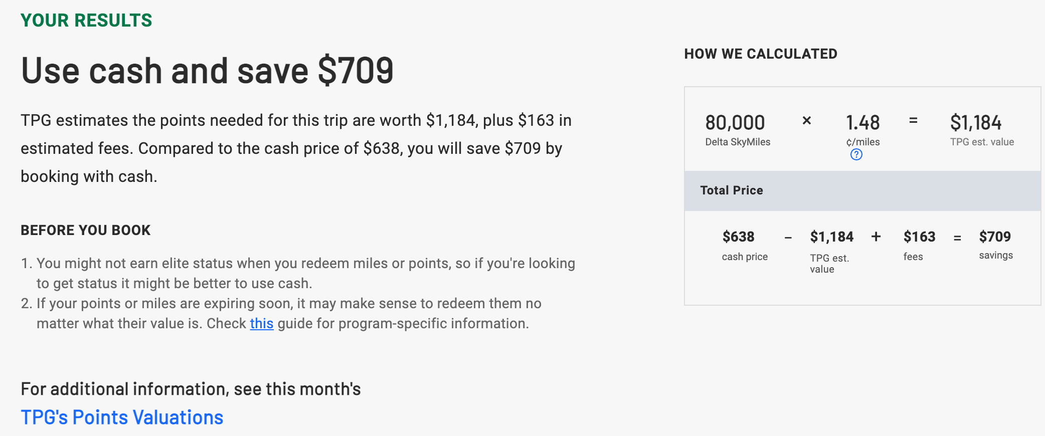 This flight would cost 80,000 Delta SkyMiles plus $164, which means using cash is also a better deal here as well.