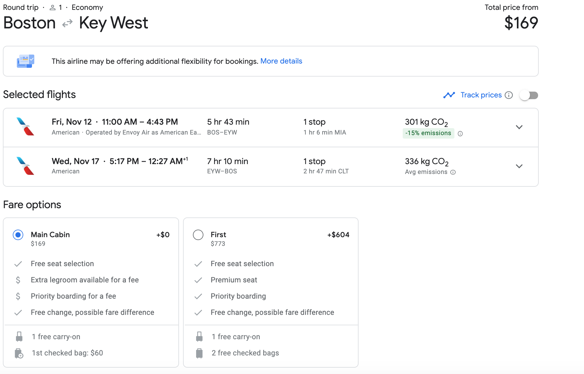 Boston to Key West has lots of availability from November to March for under $250, but mid-November had several itineraries for just $169 round-trip on American. This is for a Main Cabin seat, which has the free carry-on and seat assignment, as mentioned above.