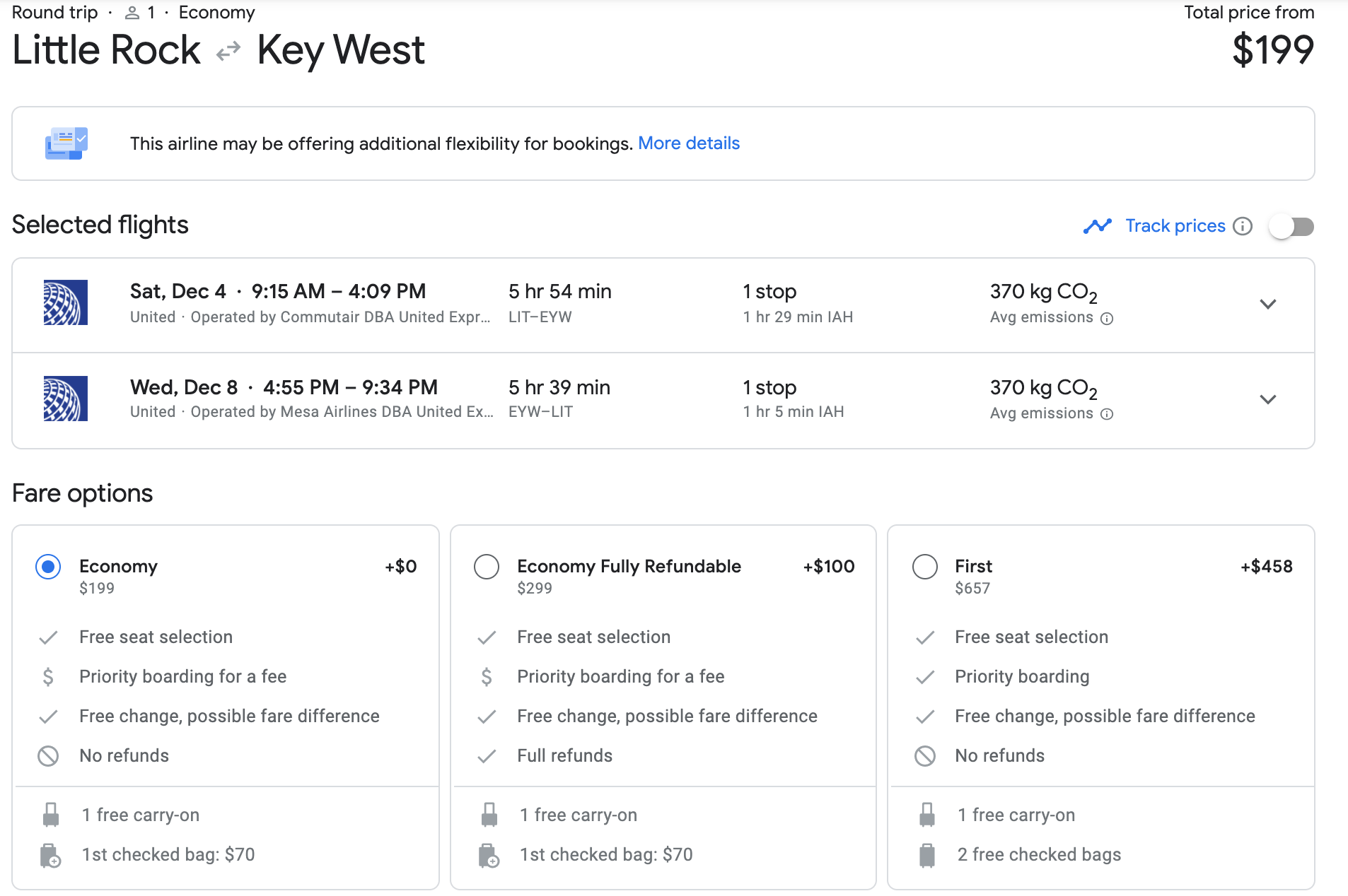 Here's an excellent deal from Little Rock to the Keys for under $200. We didn't see as much availability at this price point for this route, so Arkansas travelers thinking of heading south should jump on this now. This is for United's Economy tier, so you get free seat selection and a carry-on, plus you can change your flight at no charge, but you will have to pay any difference in the ticket price.