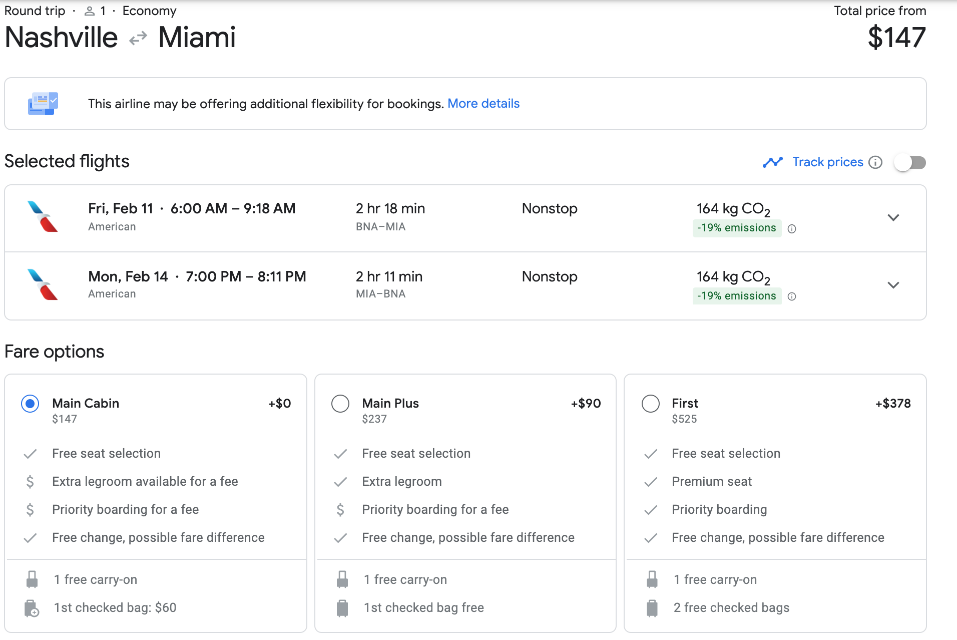 American and United fares are for Main Cabin seats, which come with a free carry-on and seat assignment. Delta bookings are for Basic Economy.