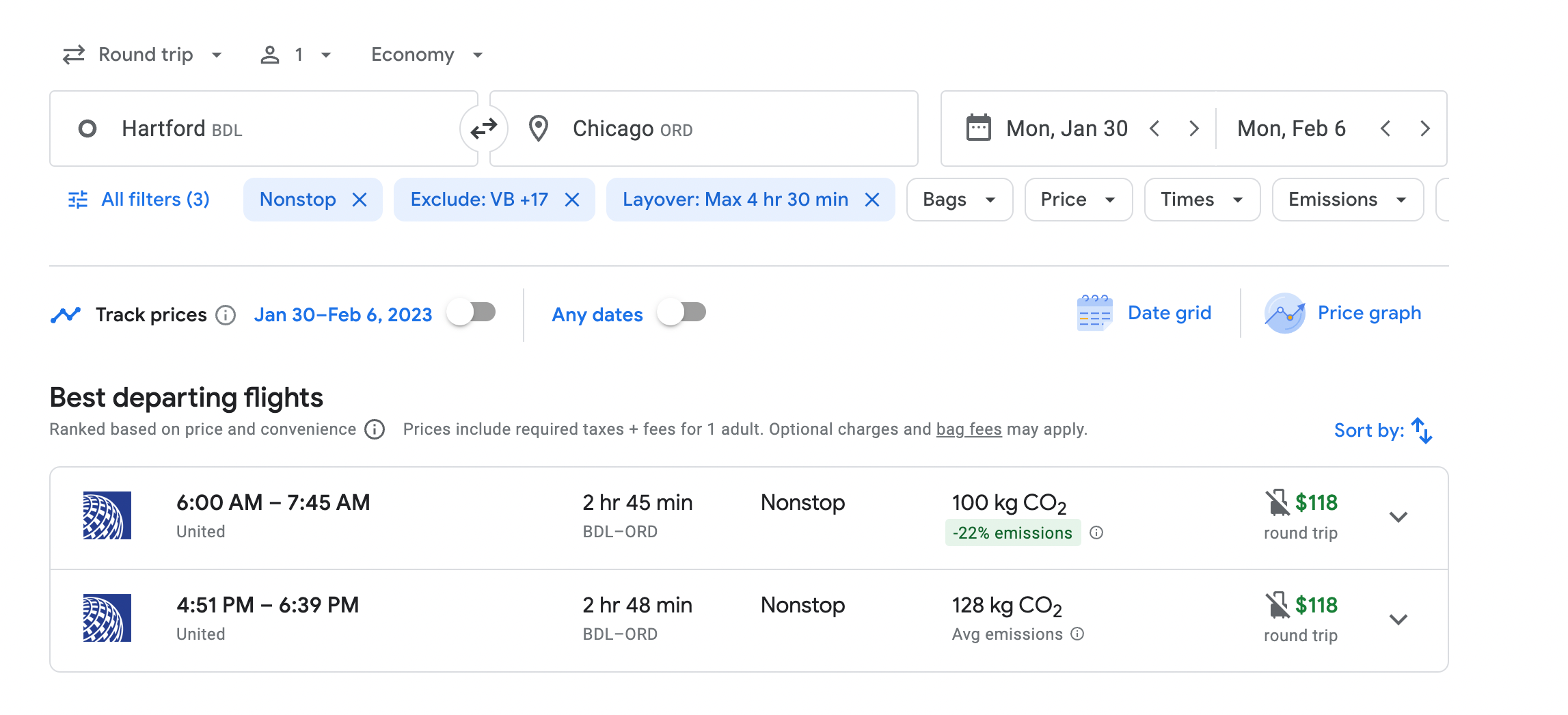 If you're flying from Hartford on Jan. 31, United has two flights at $118 — one departs at 6 a.m. and the other at 4:51 p.m. For returning flights, United offers one at 6:28 p.m. on Feb. 6 at the same $118 price.