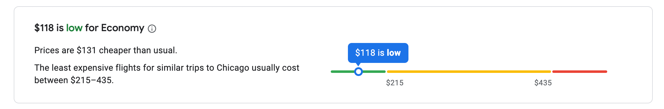 The $118 price tag for a trip to Chicago is considered to be low, since the cheapest possible flights to Chicago cost anywhere from $215 to $435, according to Google Flights.