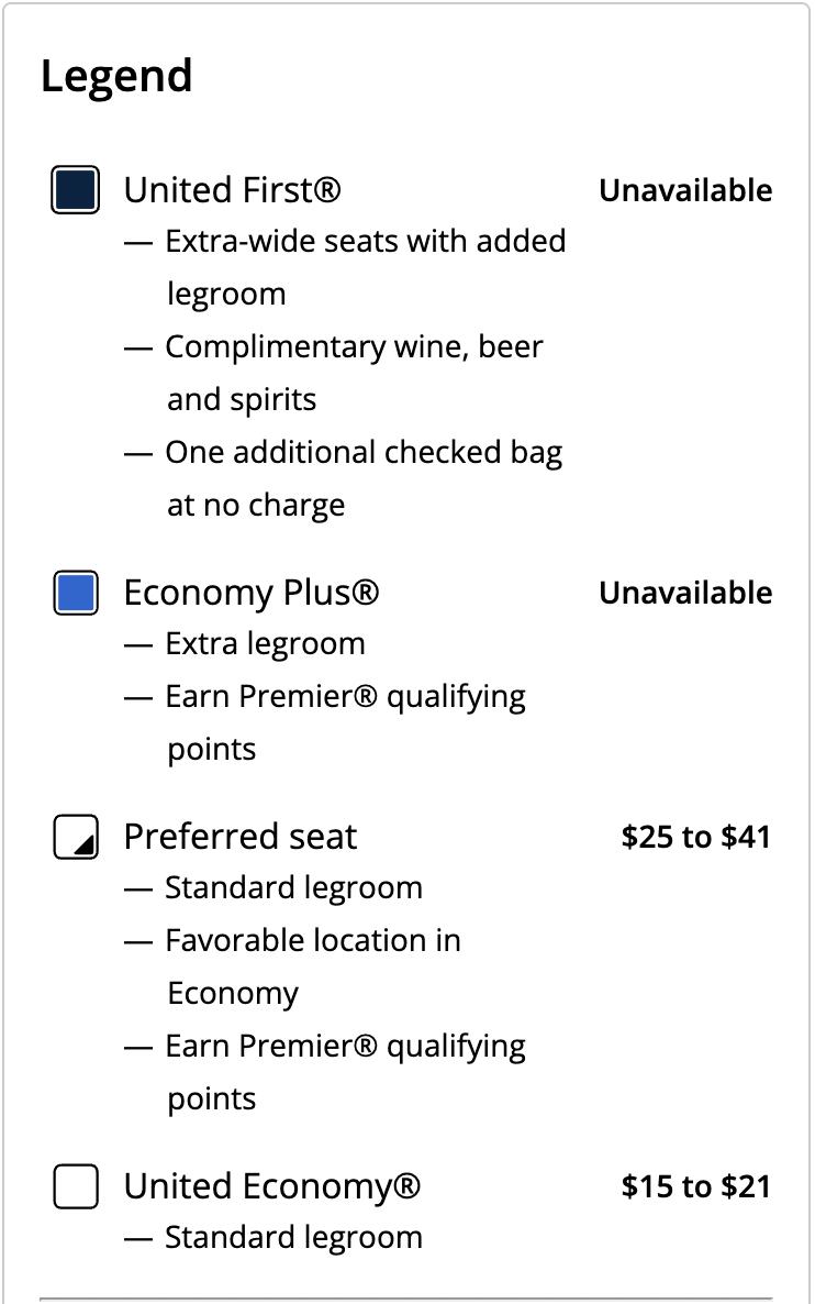 As for seat selection, United economy class seats cost between $15 and $21 — the aisle seats are on the more expensive end, whereas middle seats are the cheapest. You can also pay anywhere from $25 to $41 for a United preferred seat which features more legroom.