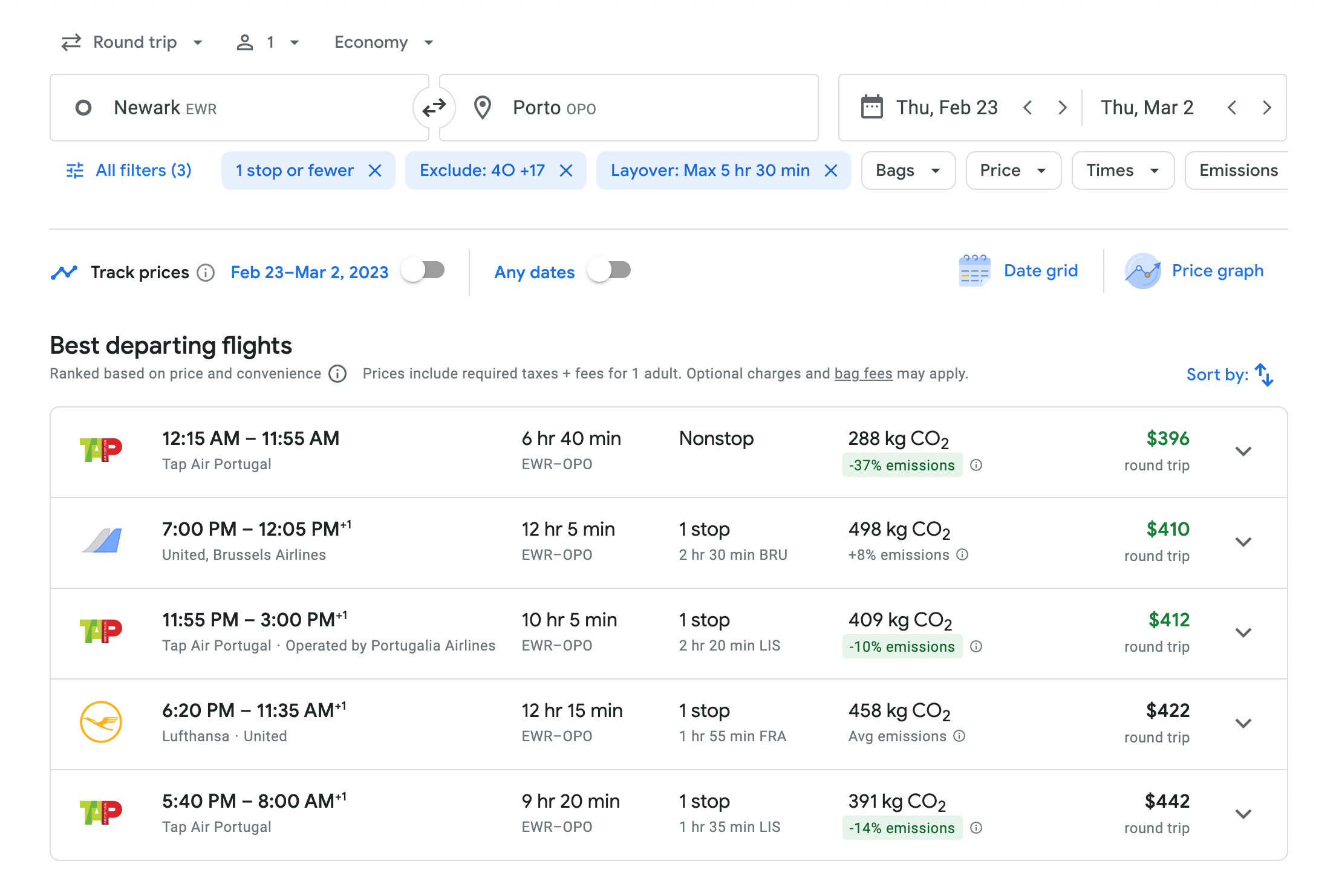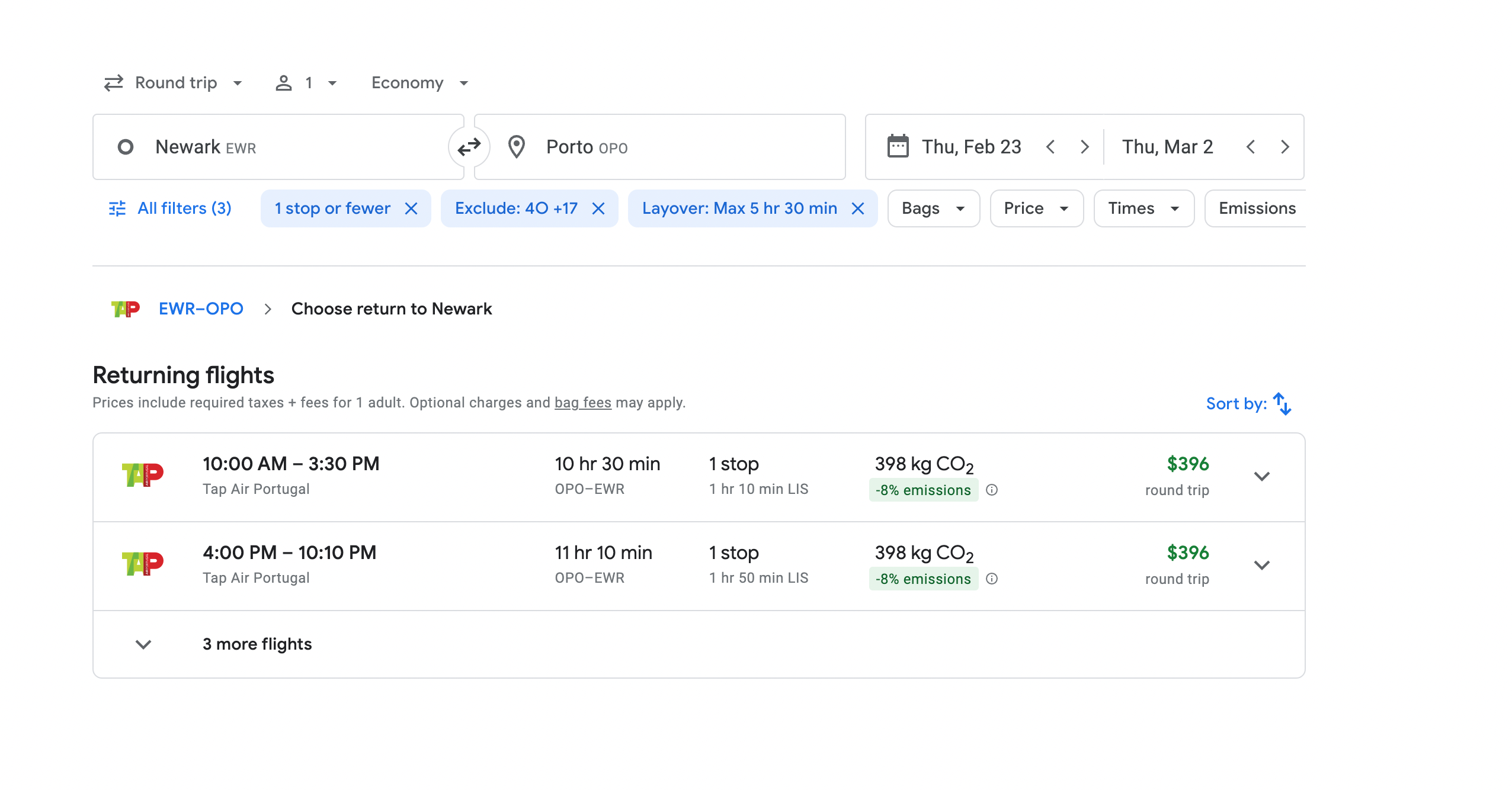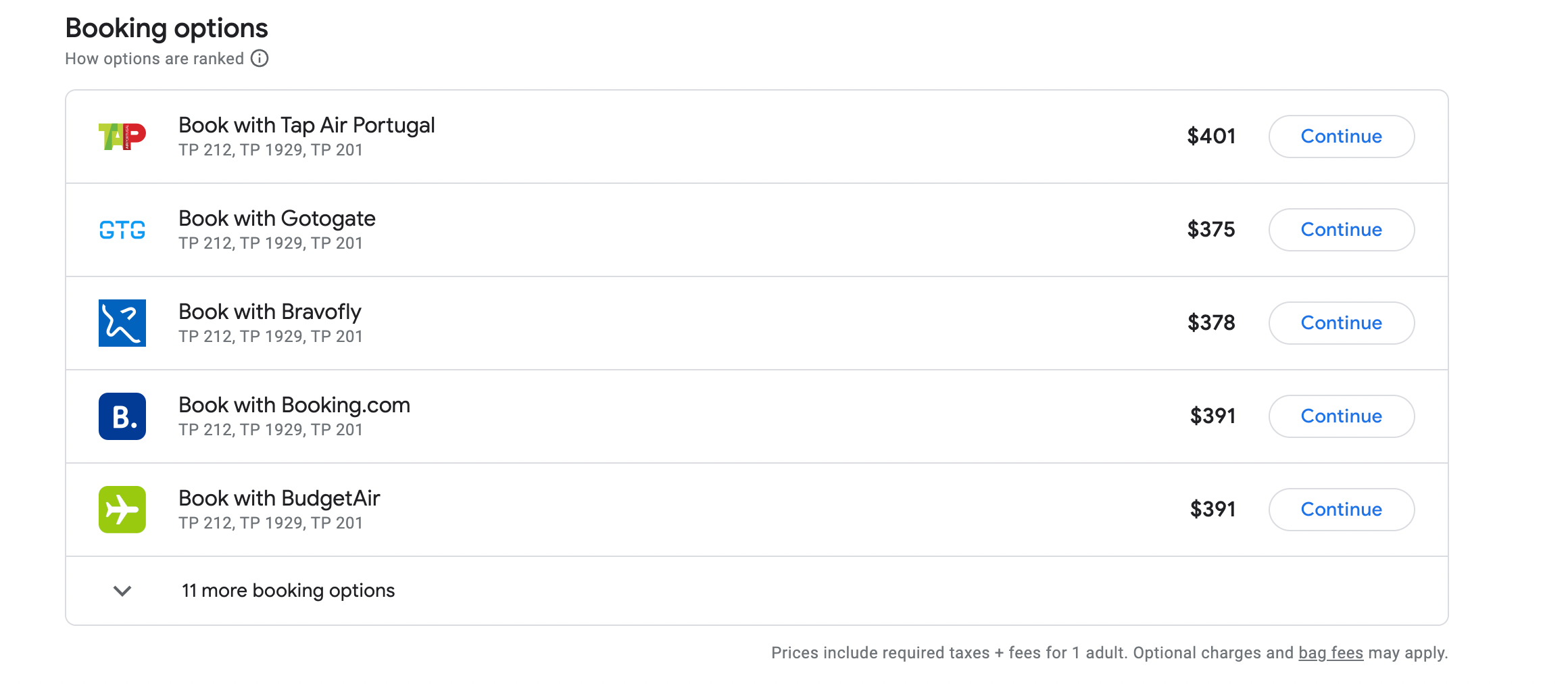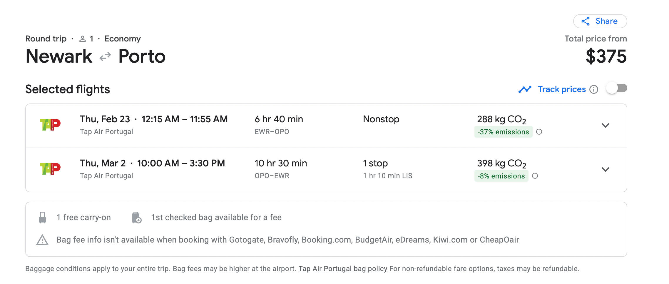 Since Google Flights also aggregates third-party booking options, there can be price discrepancies between Google Flights and the airline's website. For this particular trip, Google Flights says the fare costs $375, but if you were to book directly with TAP, it would cost slightly more. (Google Flights says TAP is charging $401, but the website says the fare is around $382.)