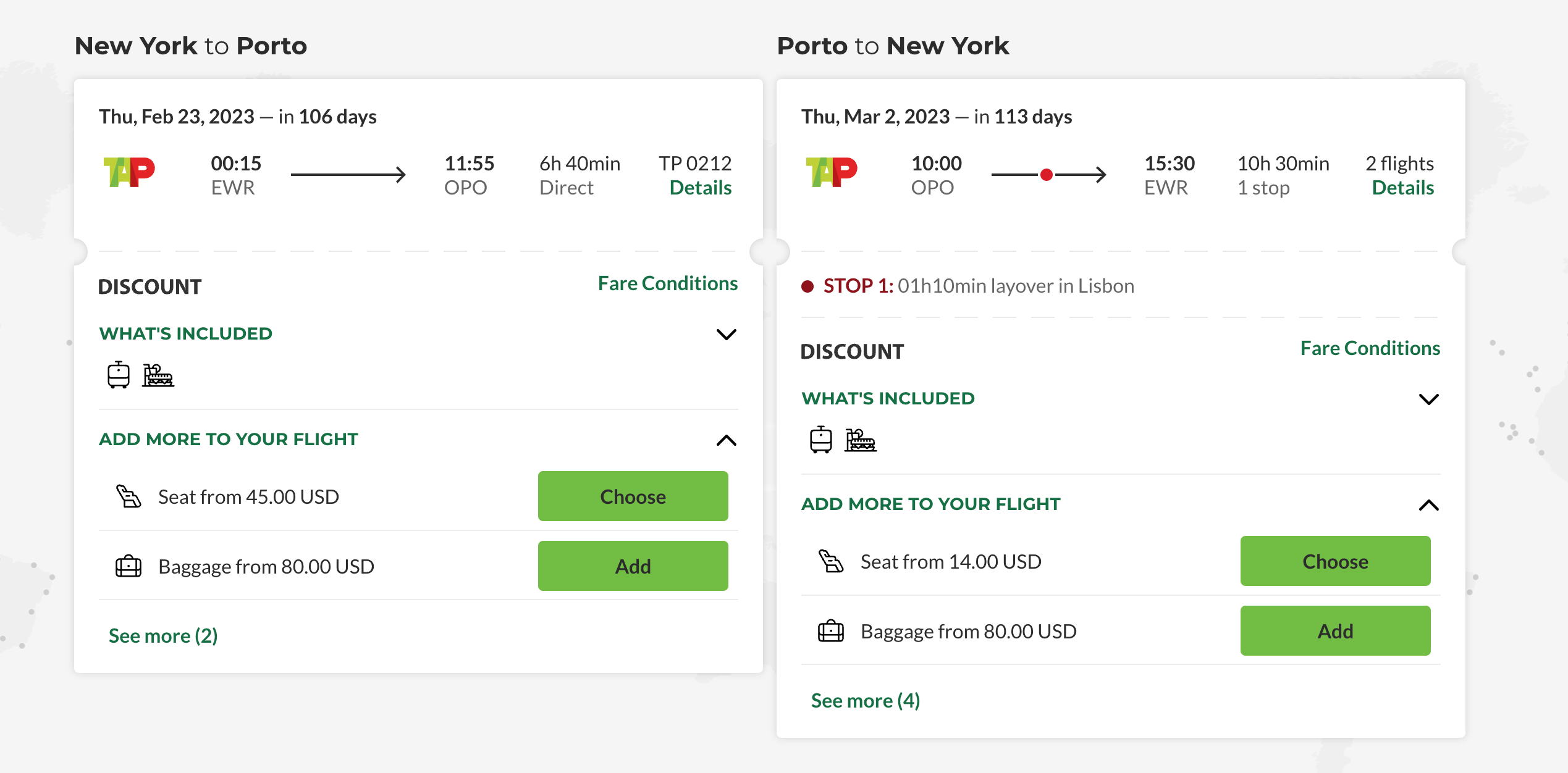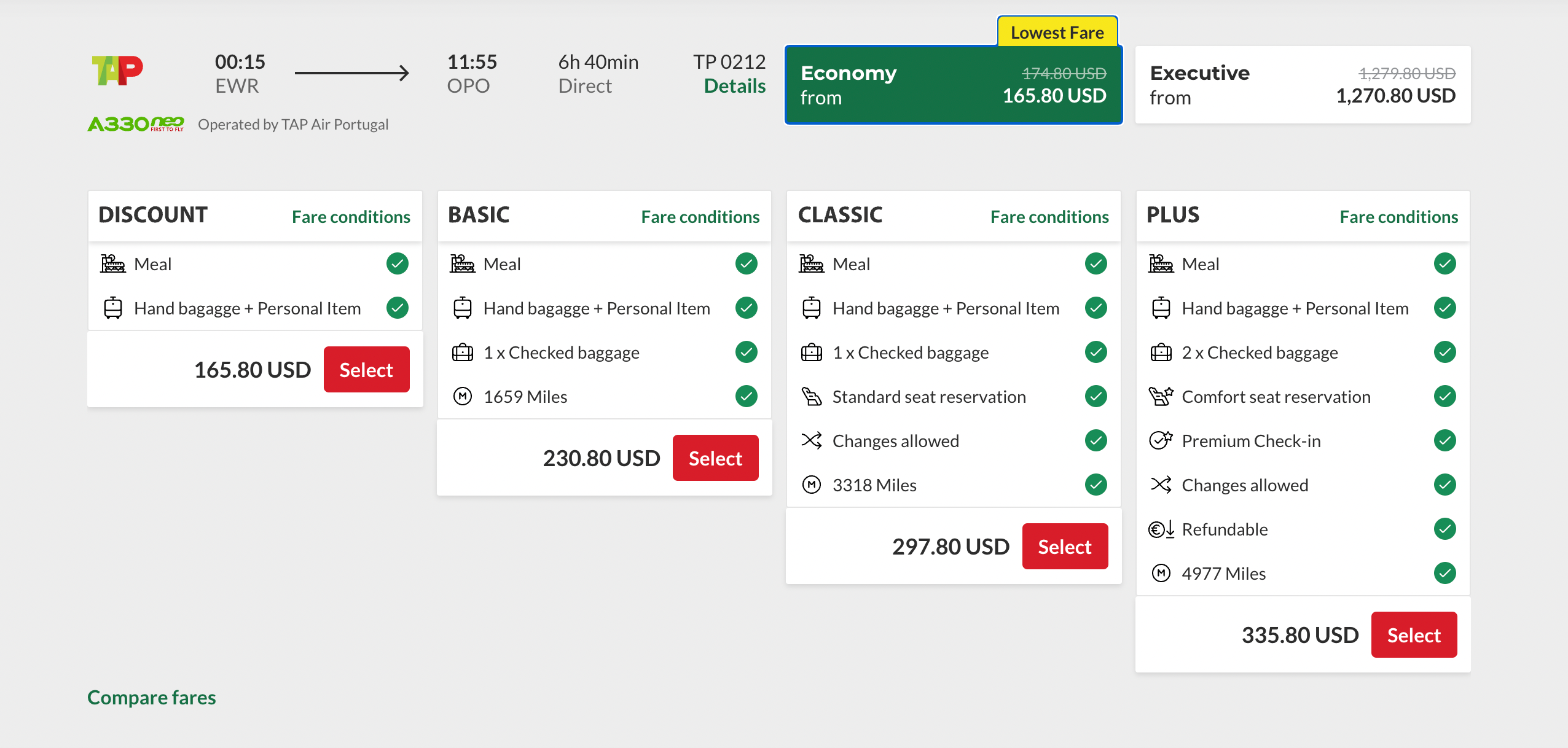 All of these discounted fares to Portugal apply to basic economy. TAP's Discount price only allows passengers to bring a carry-on; all other add-ons such as seat selection and checked luggage have additional fees.