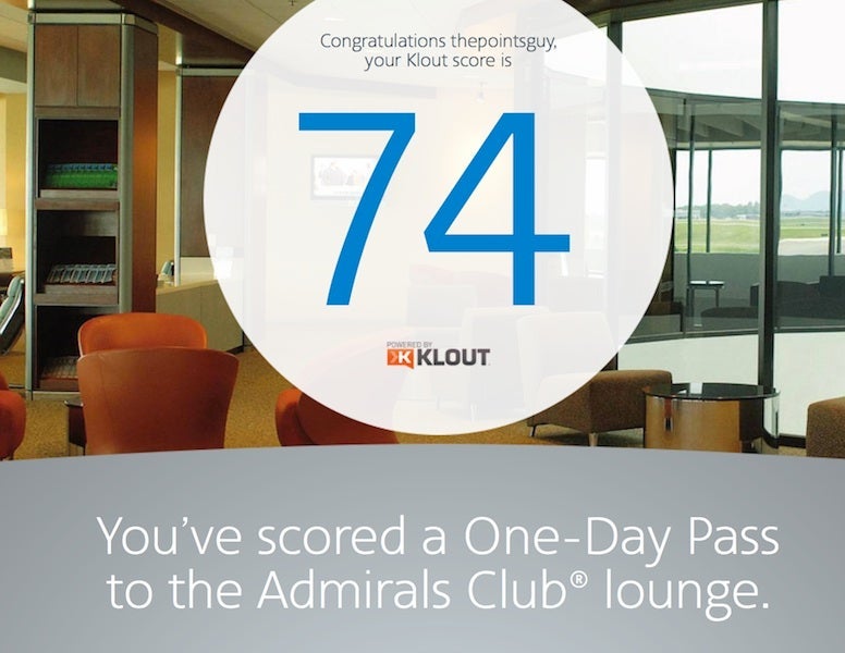 Entrants with a Klout score of 55 or higher will receive one free One-Day Pass to the Admirals Club and if you purchase a new annual Admirals Club membership within 30 days of your visit, you get a $50 discount.