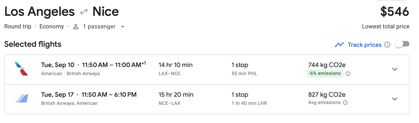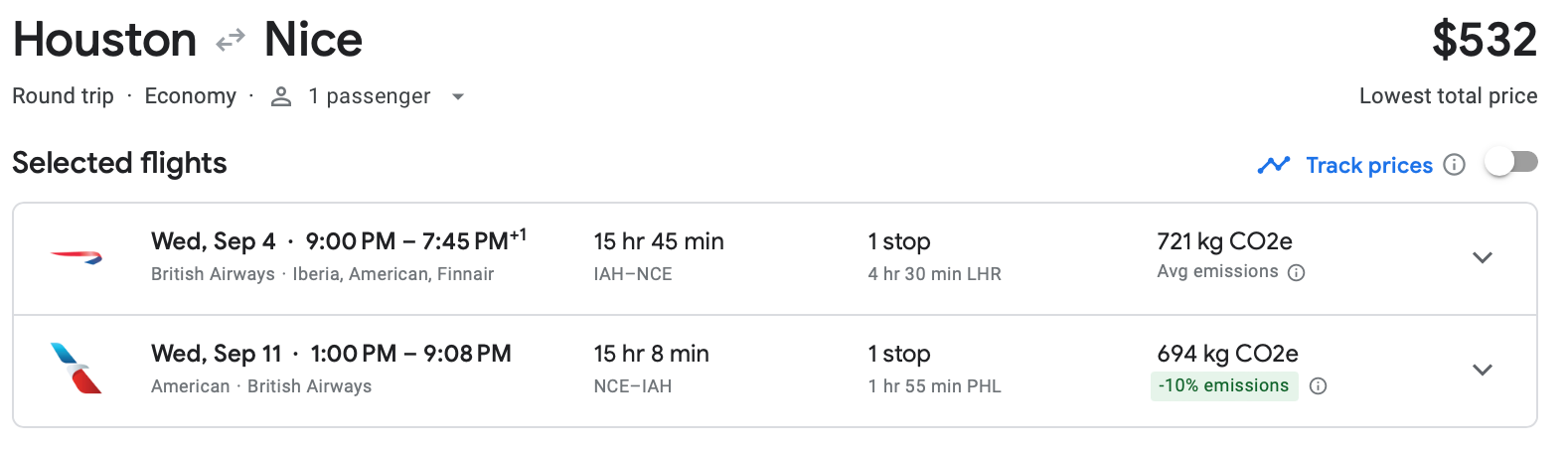 We found good availability from Houston to the French Riviera in early September. This American itinerary from IAH to NCE can be booked for $532 round-trip.
