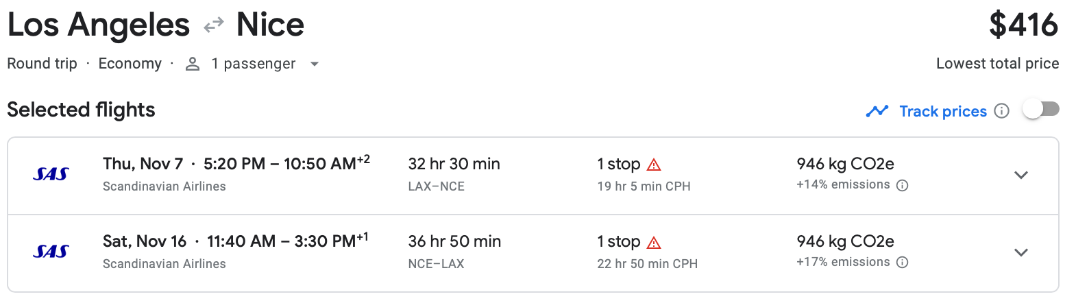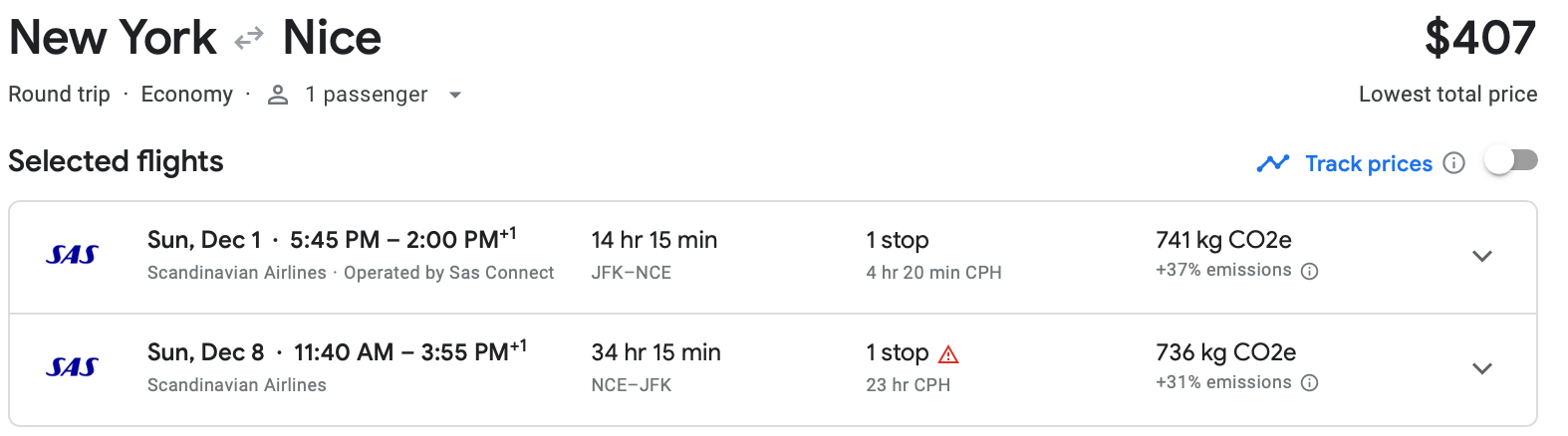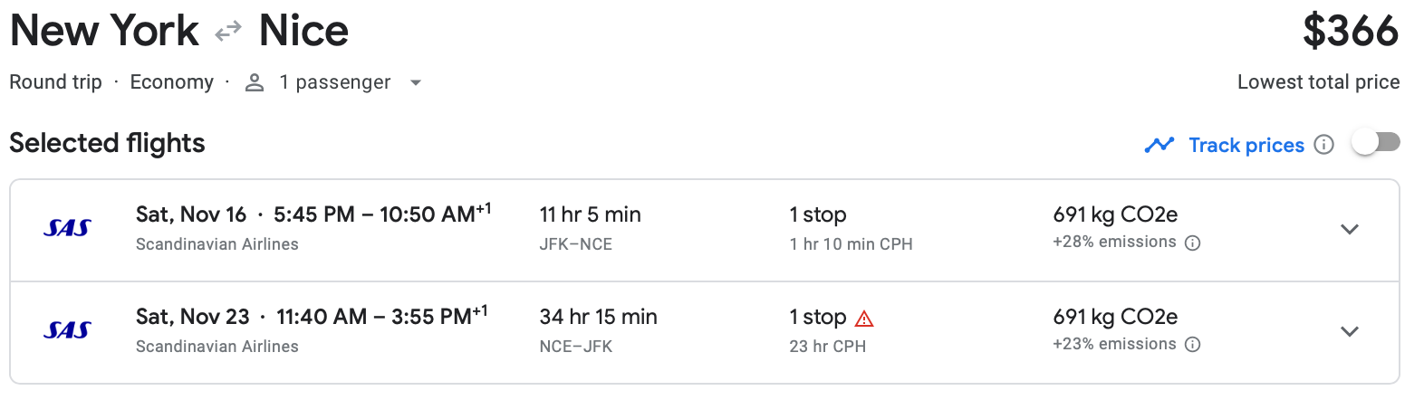 Scandinavian Airlines, commonly known as SAS, offers several discounted flights from New York City to the French Riviera. This November itinerary from John F. Kennedy International Airport (JFK) to NCE is available for only $366 round-trip.