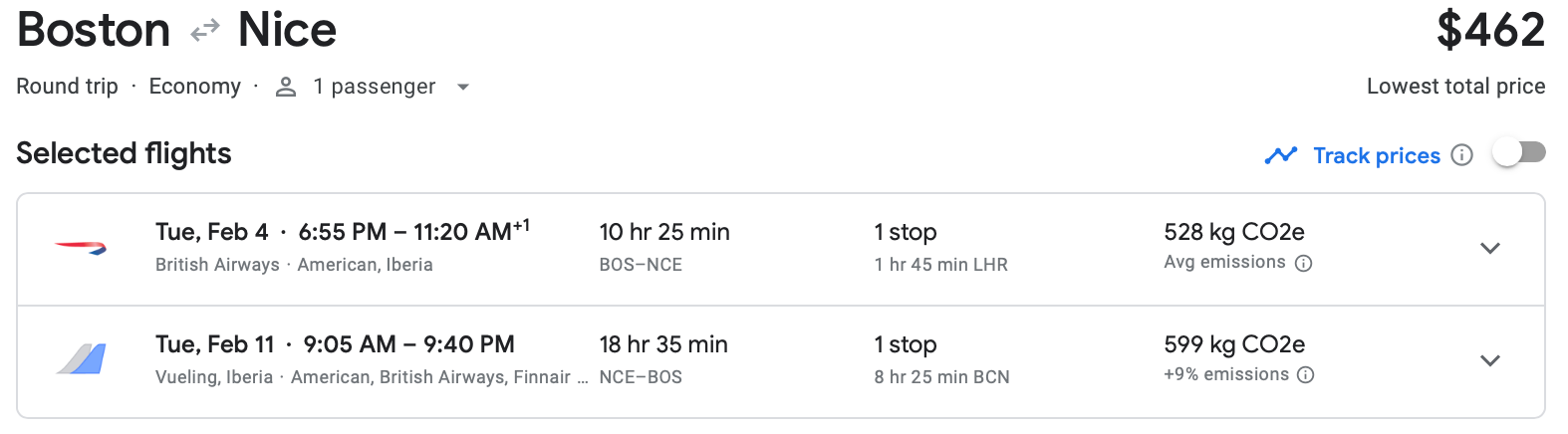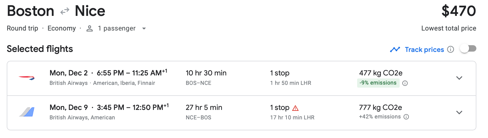 British Airways has fares from Boston Logan International Airport (BOS) to NCE in December for $470 round-trip.