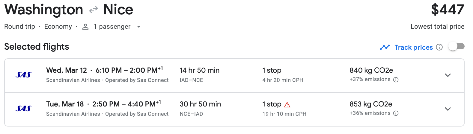 You can book an SAS flight from Dulles International Airport (IAD) to NCE in mid-March for $447 round-trip.