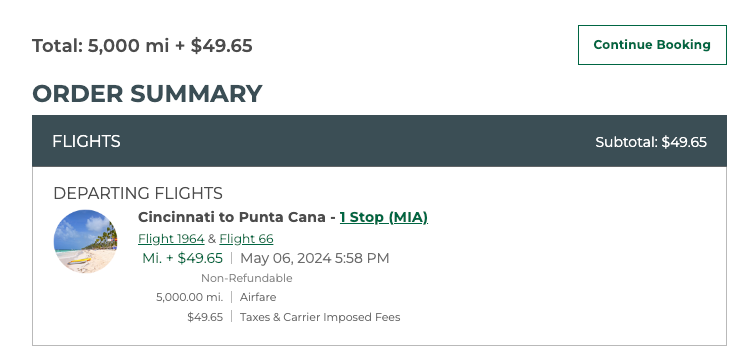If you want to fly a little farther south, we also found a one-way flight from Cincinnati/Northern Kentucky International Airport (CVG) to Punta Cana International Airport (PUJ) for only 5,000 miles plus $49.65 in taxes and fees. If you were to book this same flight after the sale window, you could pay as much as 25,000 miles.