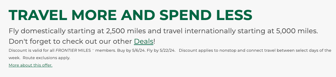 This offer is only valid for members of Frontier's free Frontier Miles loyalty program. Seats are limited and may not be available on all routes; all flights are subject to taxes and fees, which start at $5.60. Award flights are subject to Frontier's change and cancellation policies. Your miles will be automatically forfeited if you do not change or cancel your flight in the required window.
