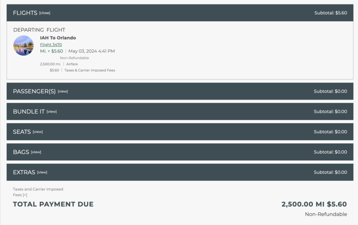 For example, we found a one-way flight between George Bush Intercontinental Airport (IAH) and Orlando International Airport (MCO) for the sale's listed starting price of 2,500 miles plus the mandatory $5.60 security fee.