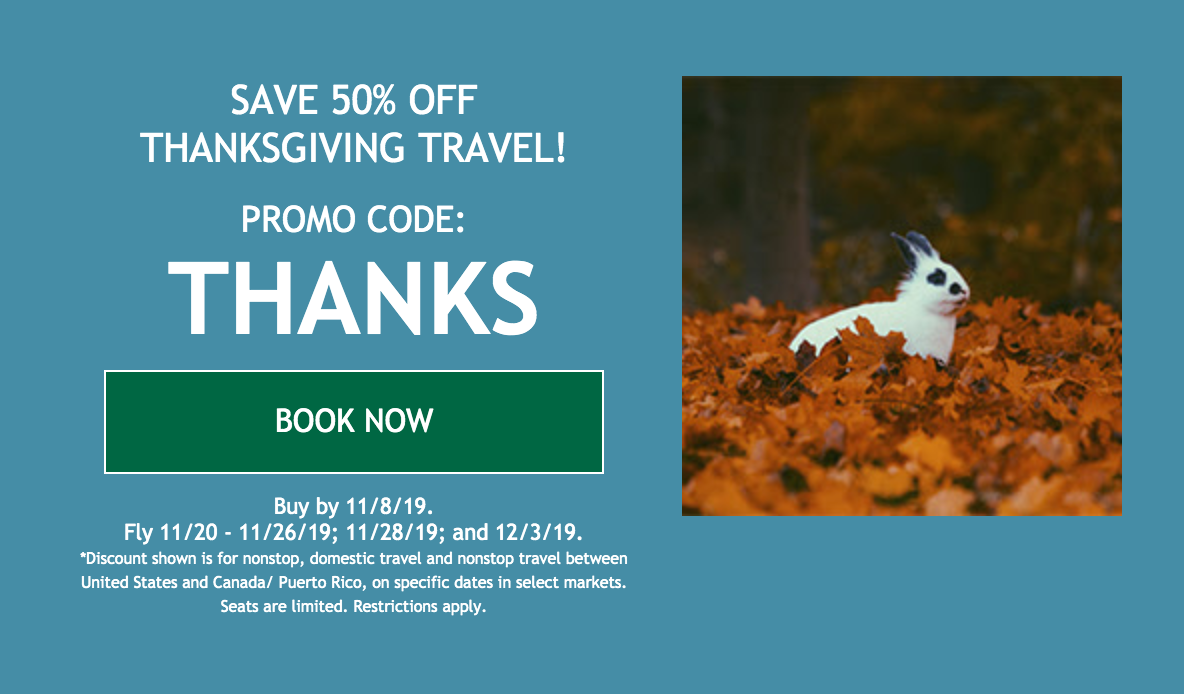On Friday, Nov. 8, Frontier is running a promotion for flights right around the Thanksgiving holiday — you can get 50% off all flights between Nov. 20 and 26, as well as flights on Nov. 28 and Dec 3. Just use promo code THANKS when booking your flight, and don't wait too long: The deal is only valid for one day and will expire at the end of Nov. 8.